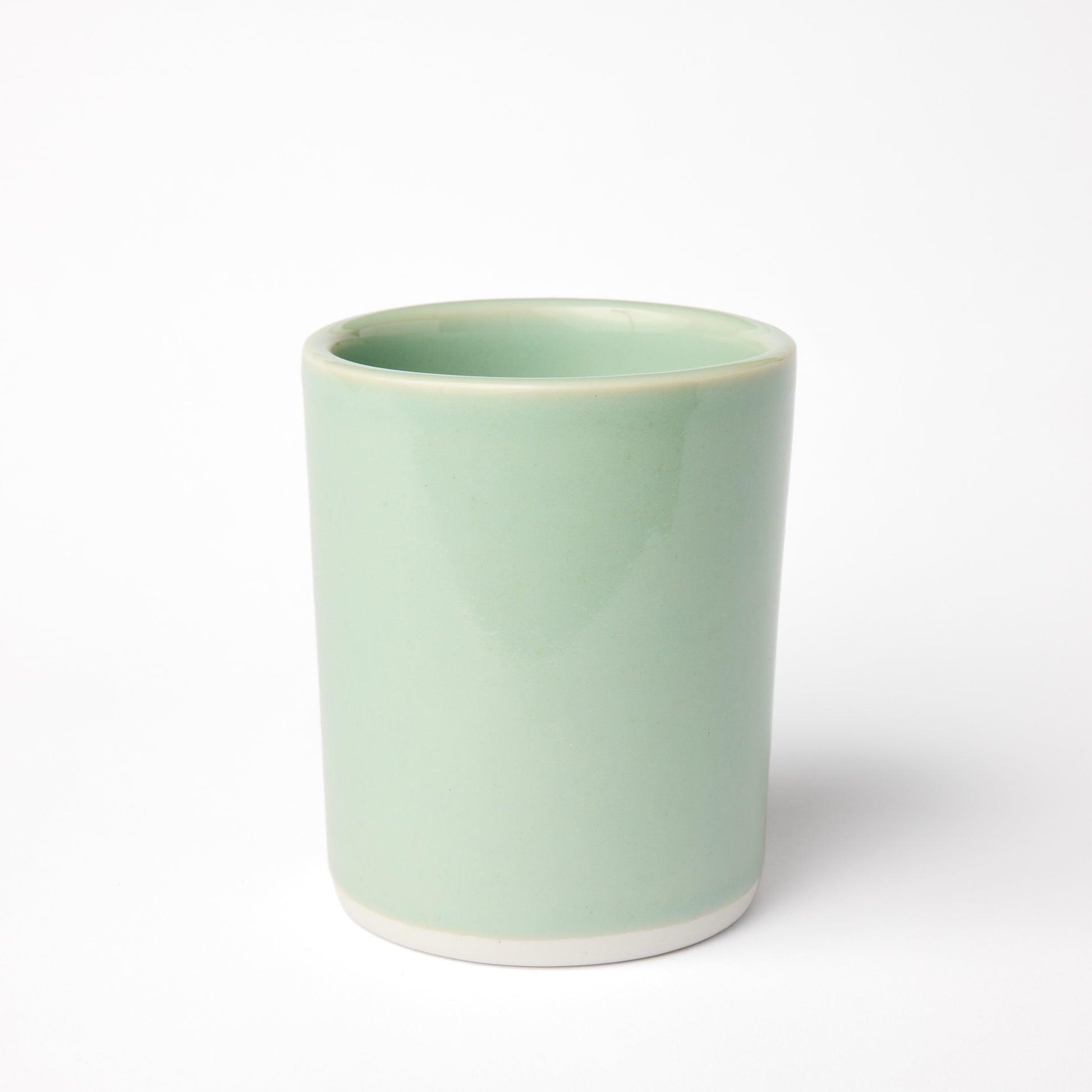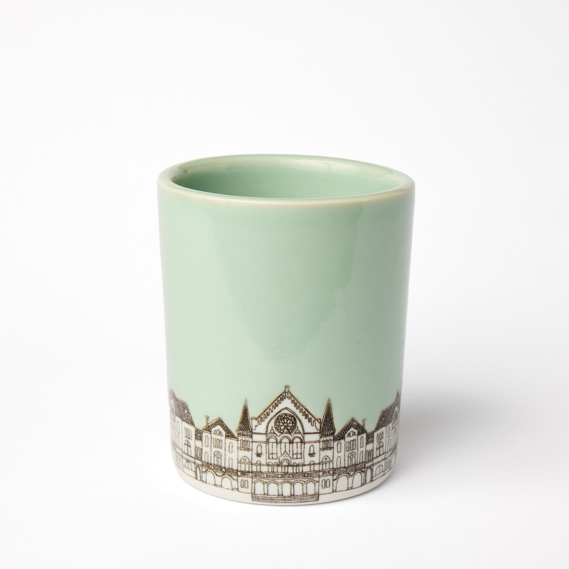 Our large celadon cup is made in the SKT studio out of durable, high fire porcelain, screen printed with the original SKT Music Hall illustration. Each image is hand painted with a clear glaze to highlight the illustration and a wax resist to protect the painted glaze from being coated by our signature blue-green celadon dipping glaze.